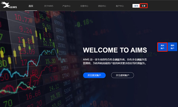 进入AIMS官网(www.aimsholdings.cn),点击网站首页右上角注册区域中的“立即开户”或者右侧浮窗的“真实账户”按钮。