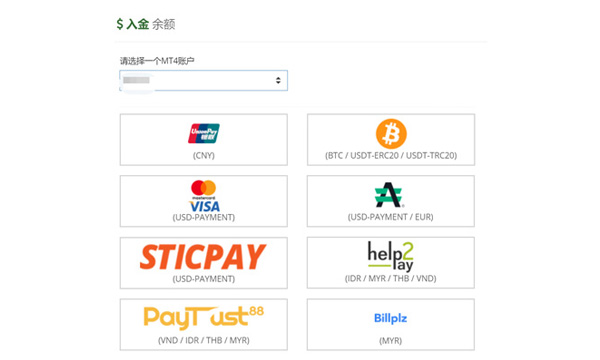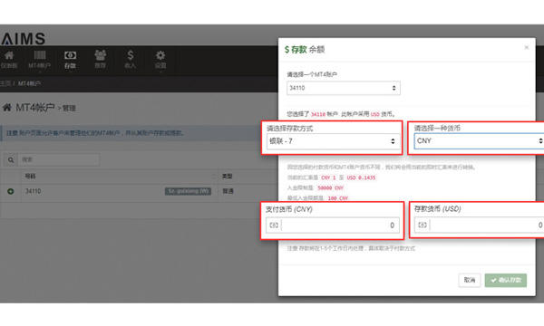 选择存款方式“银联“,选择货币“CNY”,输入存款金额后,选择支付银行,确认无误后点击确认存款”